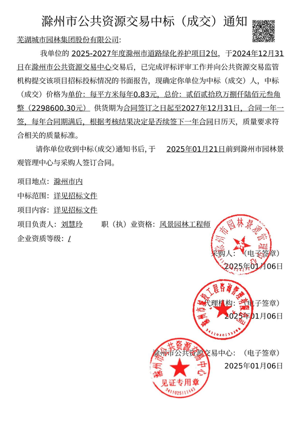 歲序更替,華章又新,園林集團(tuán)中標(biāo)喜訊傳來,成功斬獲2025-2027年度滁州市道路綠化養(yǎng)護(hù)項目2包,實現(xiàn)開門紅,獻(xiàn)上新春賀禮。此次中標(biāo),是園林集團(tuán)在滁州市綠化市場的首次亮相,也是公司在蕪湖市外業(yè)務(wù)拓展的重大突破。