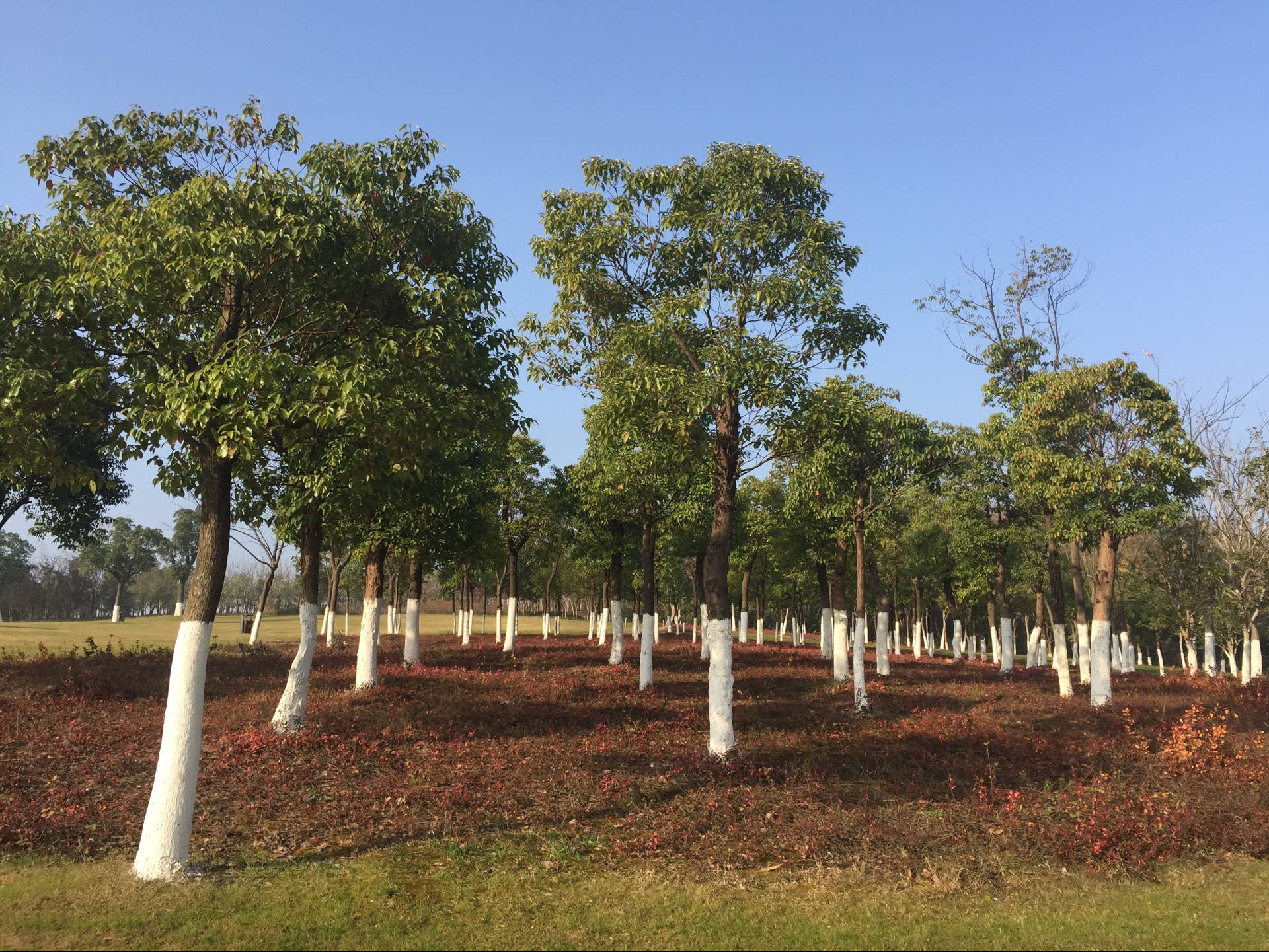 還有就是為了整齊美觀,神山苗圃綠化工程有限公司將刷白高度統(tǒng)一為1.2米,使樹(shù)木刷白與景觀融為一體,制造出別有一番的景觀與韻味。