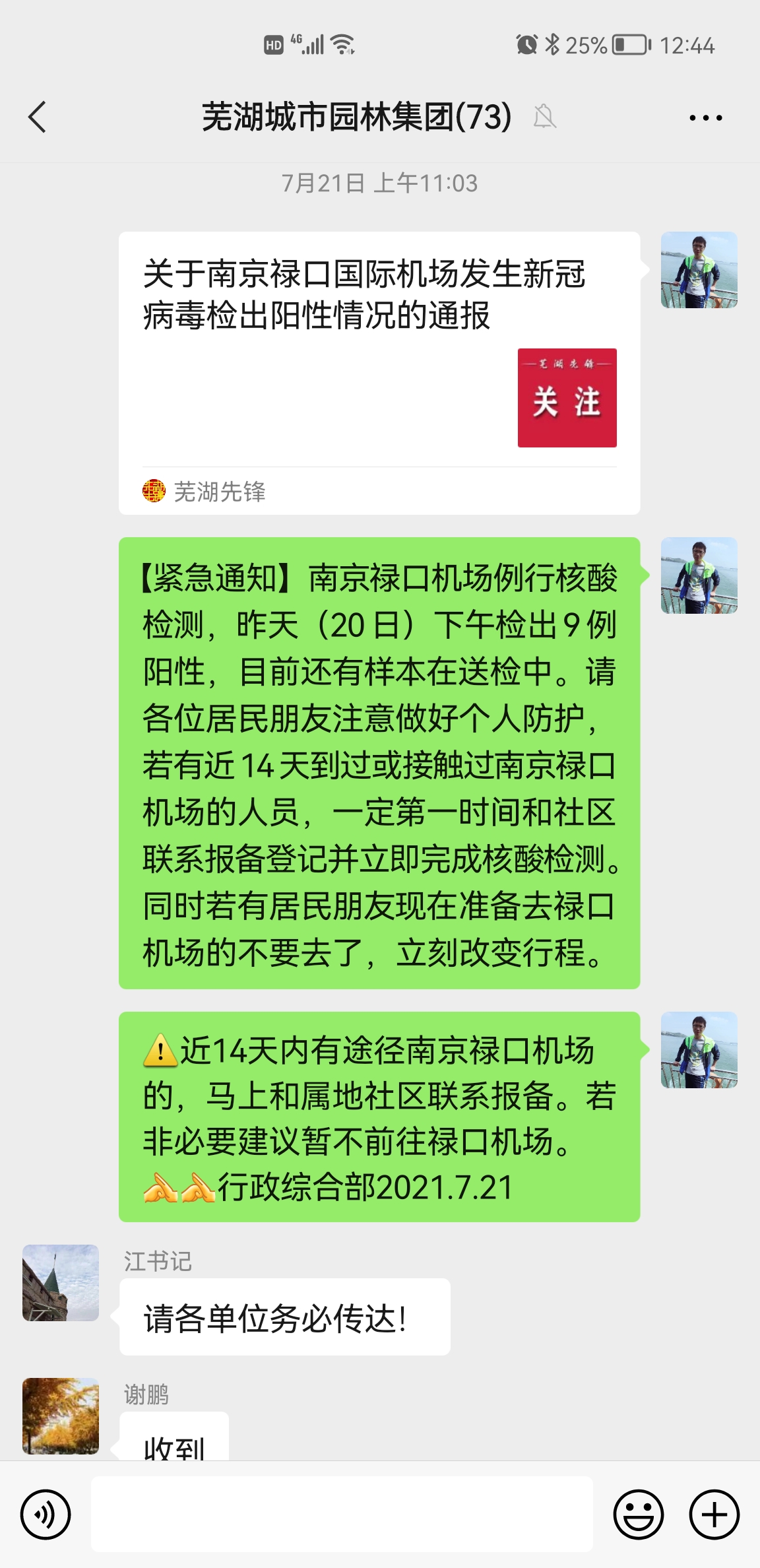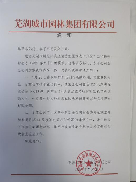 7月20日,南京祿口機(jī)場(chǎng)例行核酸檢測(cè),檢出9例陽性。情況發(fā)生后,園林集團(tuán)黨委高度重視。結(jié)合市新冠疫情防控暨推進(jìn)“六穩(wěn)”工作指揮部(2021第2號(hào))文件精神,集團(tuán)公司主要領(lǐng)導(dǎo)第一時(shí)間作出批示,立即啟動(dòng)《園林集團(tuán)新冠從嚴(yán)快速做好各項(xiàng)防控措施》。