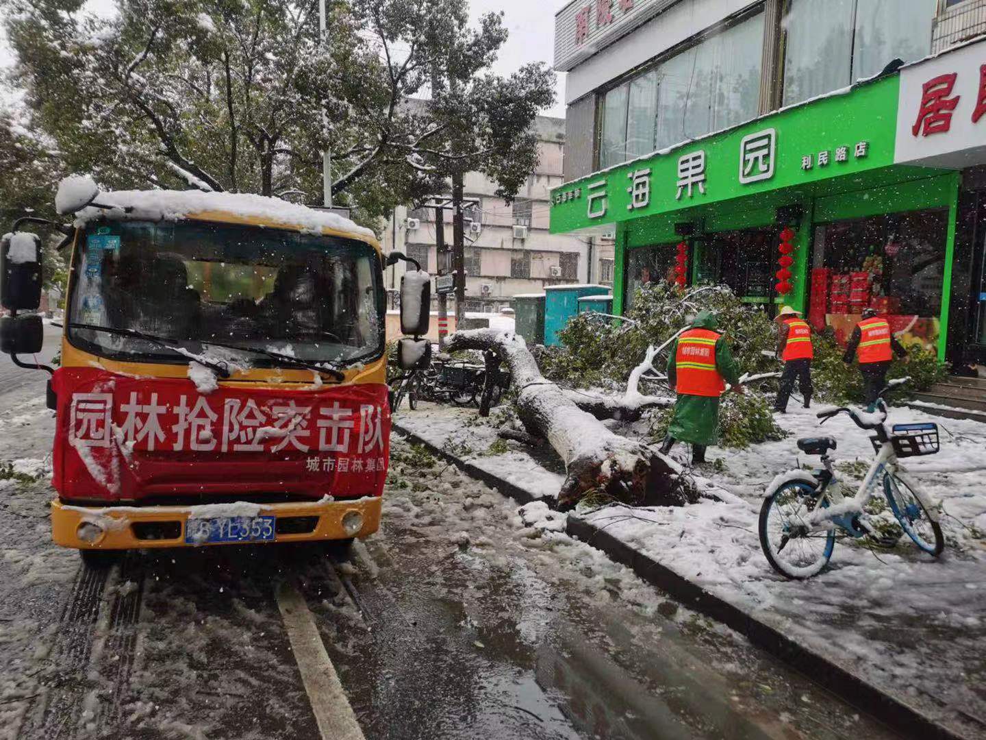 由于積雪負(fù)荷過重極易壓垮樹枝,存在安全隱患,蕪湖城市園林集團(tuán)有限公司組織由七個除雪應(yīng)急突擊隊分組推進(jìn),對各公園、道路、綠地等進(jìn)行清雪工作,并對各類設(shè)施、設(shè)備進(jìn)行安全檢查,利用竹竿敲打行道樹及綠化帶內(nèi)的積雪,及時清理管轄區(qū)域內(nèi)傾斜、倒伏的樹木和斷枝,安排人員不間斷進(jìn)行巡視、檢查,重點對公園、廣場出入口及主要園路、石橋上的冰雪進(jìn)行清除,對可能產(chǎn)生的安全隱患及時處理。