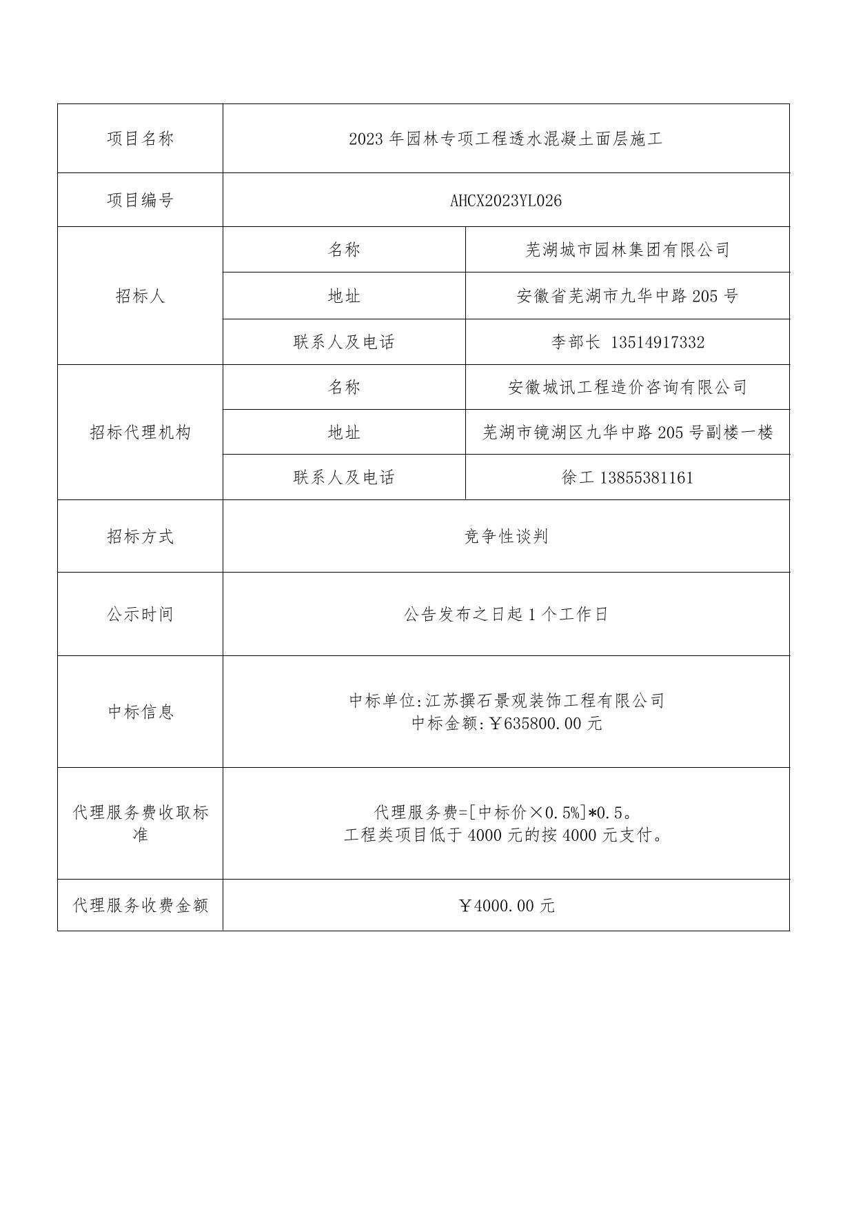 2023年園林專(zhuān)項(xiàng)工程透水混凝土面層施工中標(biāo)結(jié)果公示