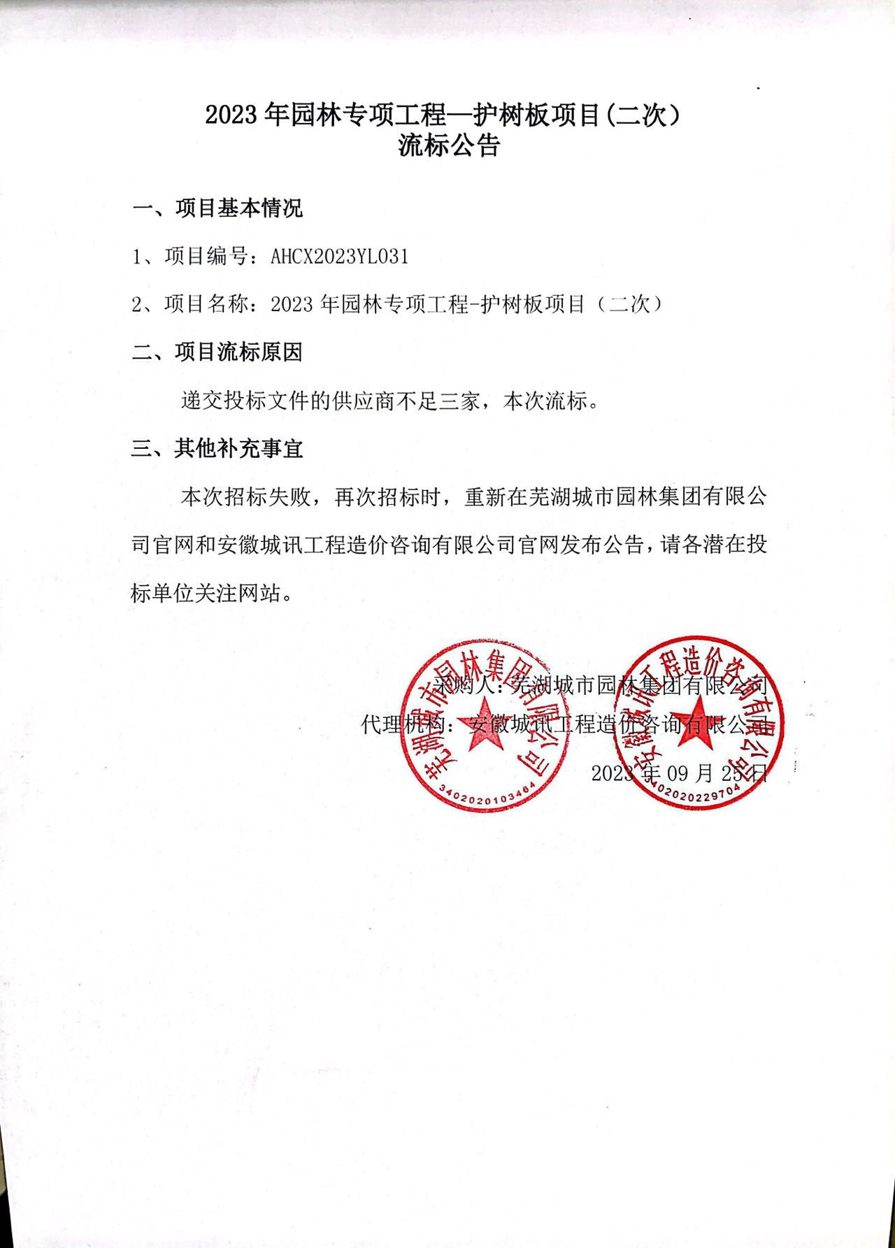 2023年園林專(zhuān)項(xiàng)工程—護(hù)樹(shù)板項(xiàng)目(二次)流標(biāo)公告