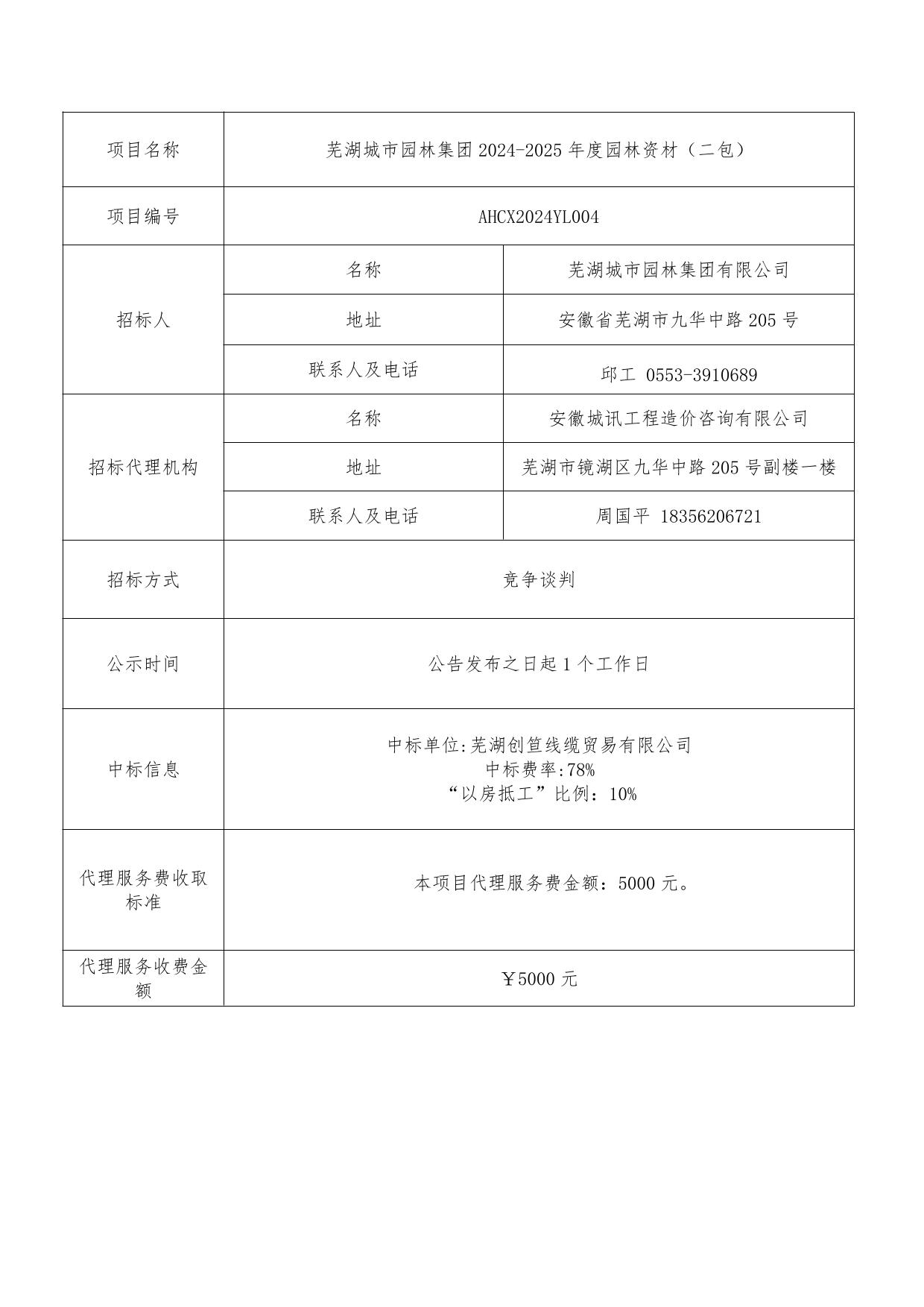 蕪湖城市園林集團2024-2025年度園林資材(二包)成交結(jié)果公示