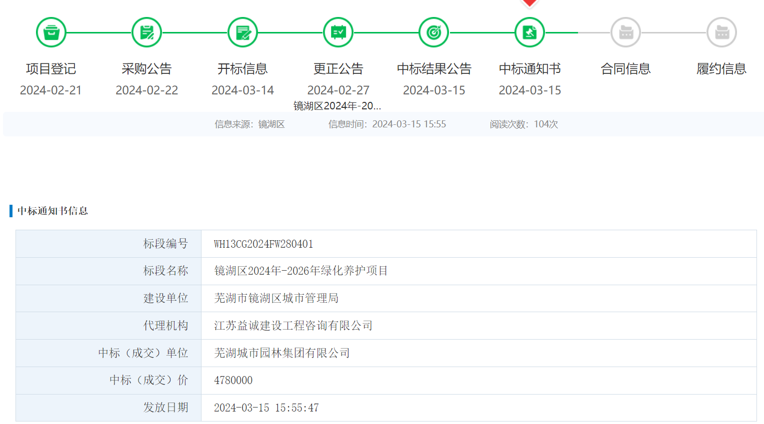 2024年3月,蕪湖城市園林集團(tuán)中標(biāo)鏡湖區(qū)2024年-2026年綠化養(yǎng)護(hù)項(xiàng)目,中標(biāo)總價(jià)1434萬(wàn)元,合同期為3年。